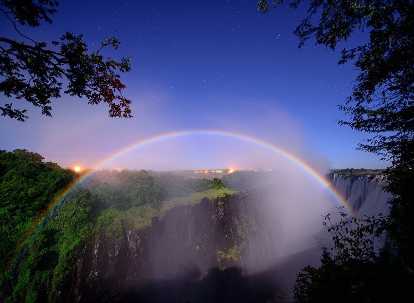 Это удивительное природное явление можно увидеть в районе водопада только благодаря тому, что здесь достаточно яркий свет от луны. Лунная радуга представляет собой белую полосу света, имеющую полукруглую форму. Но такая радуга достаточно тусклая из-за слабого лунного света. Человеческие фоторецепторы глаза не могут уловить тончайшие оттенки луча.
