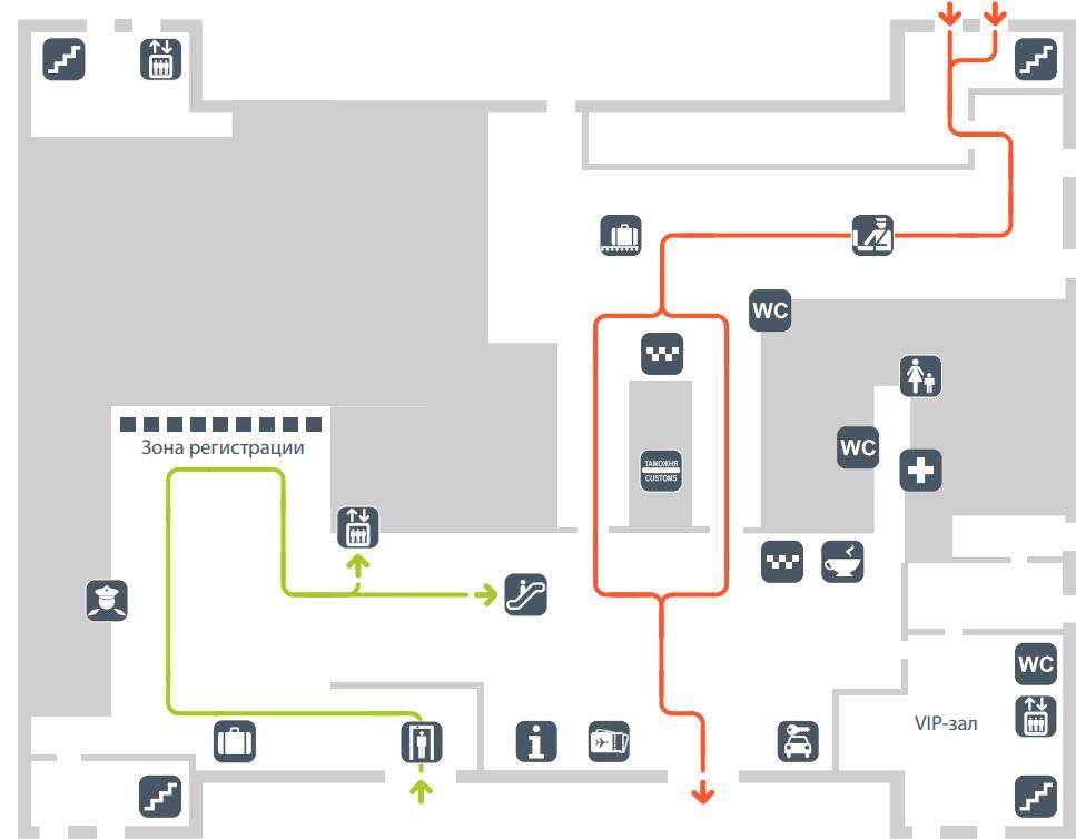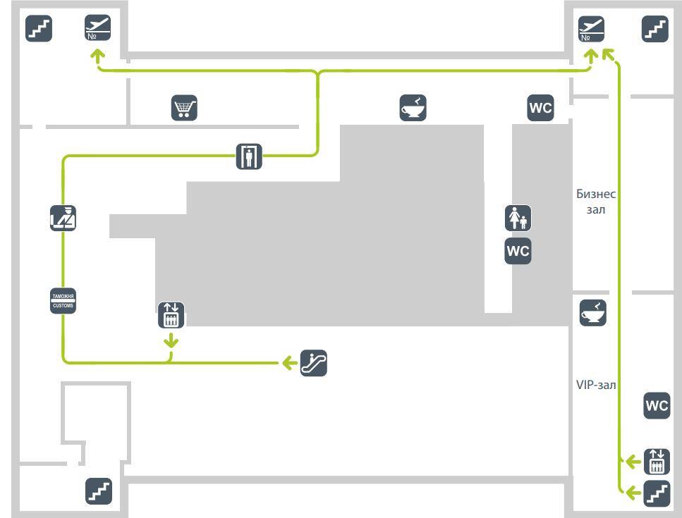 Гражданам с ограниченными возможностями оказывается услуга по сопровождению к самолету, пункту выдачи багажа, помощь при прохождении разных видов контроля, предоставляется кресло-коляска для передвижения по залам.