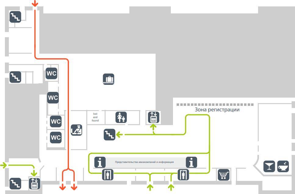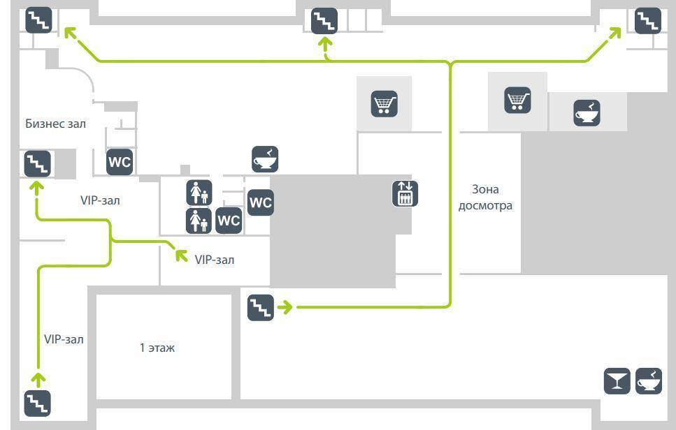 залы ожидания разной степени комфортности (2 бизнес-зала с доставкой к борту, питанием, беспроводным выходом в сеть, прессой ТВ и прочим, VIP зал с условиями для презентаций и ведения переговоров, доставкой багажа и пр.);