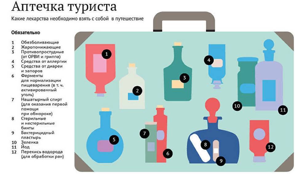 В дорожной аптечке не должно быть ничего лишнего. В то же время в нее стоит положить жаропонижающие и обезболивающие препараты, лекарства, помогающие при расстройстве пищеварения, таблетки от аллергии, обеззараживающие (антисептические) средства.