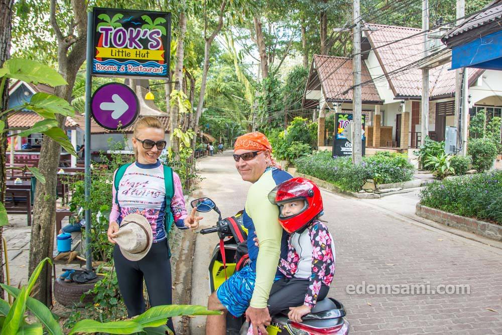 2. Второй удобный вариант для тех, кто водит байк, – арендовать байк тут же на площади. Расценки одинаковые по всему острову: 100 батов час, 200 батов – 3 часа, 300 батов – сутки. На байке удобно прокатиться по всему острову и разведать все пляжи – они разные и красивые. Стоит ли брать байк на все время пребывания на острове? Ну не знаю. От ближних пляжей удобно дойти пешком до 7/11 и деревни, а также гулять вдоль берега по соседним пляжам. С дальними все сложнее, но обычно туда народ едет именно за уединением, а не чтобы носиться по острову, как заведенный. Так что, пожалуй, байк бы я рекомендовала брать на сутки.