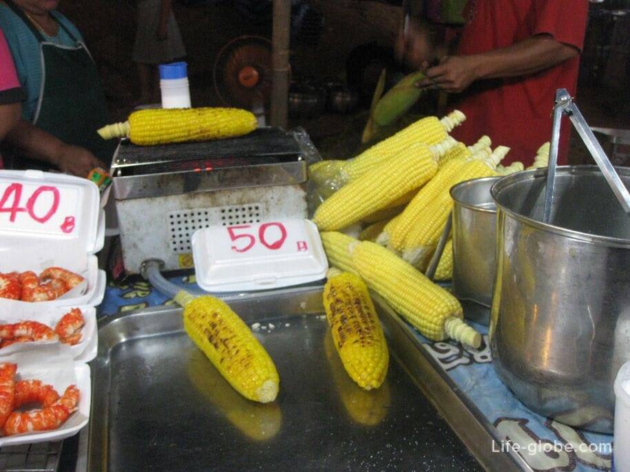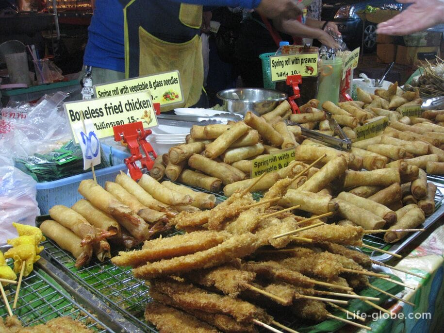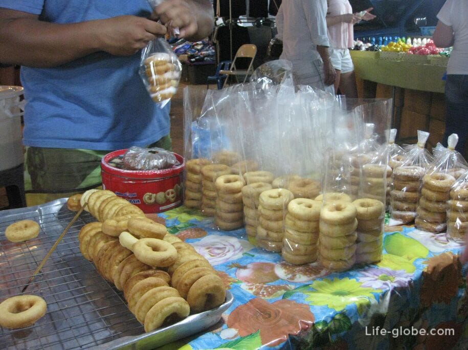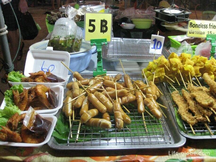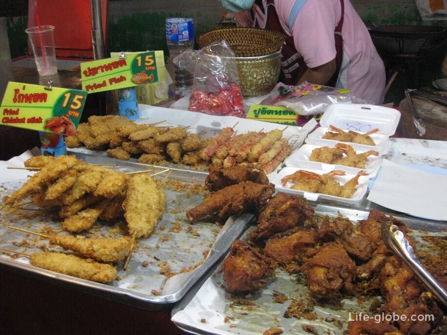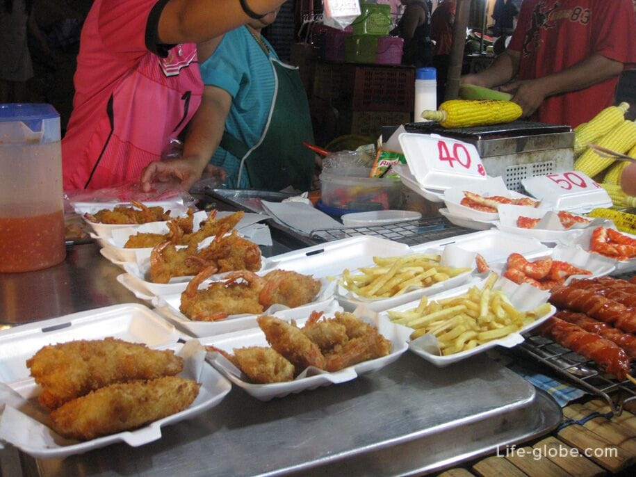 На рынке копченая рыба, курица, ребрышки, креветки, яйца, пончики, панкейки, картофель фри, салаты, рис с различными наполнителями и прочие закуски, а также всякие тайские варева, название которых мы даже не знали