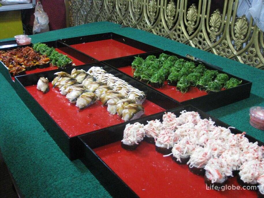 Роллы. Вот такие роллы, на вкус очень даже ничего, свежие. Внутри вареный рис, вся начинка находится сверху. Это может быть что угодно: рыба, яйца, водоросли, креветки, осьминожки, икра, салаты, крабовые палочки… вариаций множество. Стоимость одного ролла от 8 до 10 бат, соевый соус и васаби в комплекте. Подходите, берете пластиковый контейнер и набираете в него сколько и каких хотите роллов, после чего вам их посчитают и заплатите исходя из количества. Если берешь 10 – 11-й в подарок))
