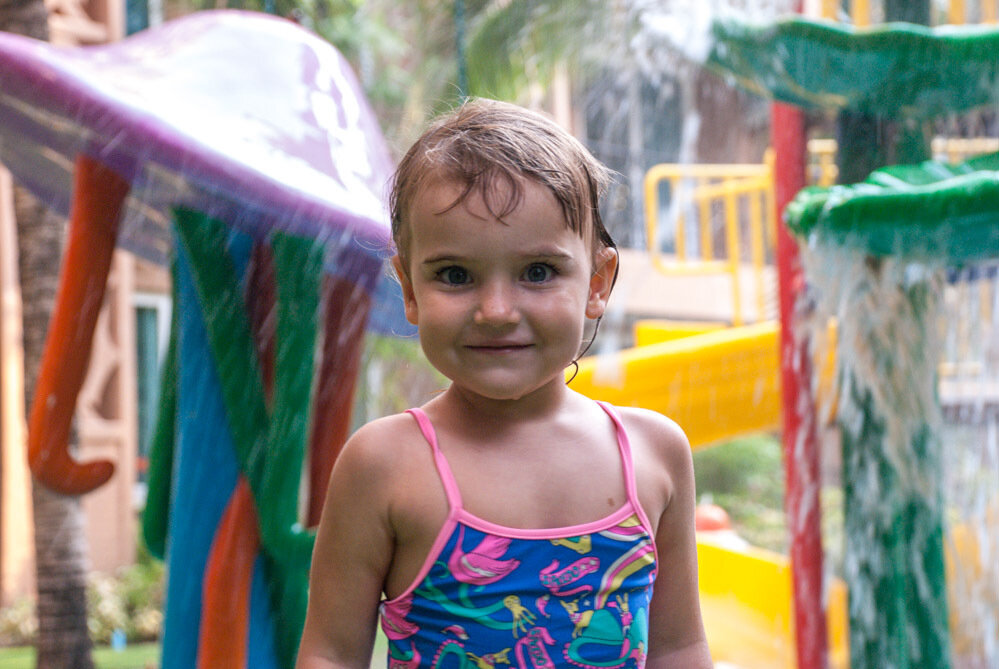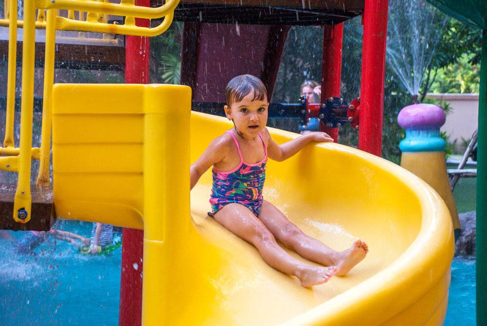 Тут ахтунг: на сегодняшний день детский аквапарк находится в плачевном состоянии: он весь проржавел, и хотя управляющая компания грозится его отремонтировать, пока что горки и грибочки уныло стоят среди воды без посетителей. В целом, верю, что отремонтируют, вопрос – когда. Сейчас, например, на ремонте и знаменитый корабль, который должен был быть готов в концу августа, но пока что все еще в синей пленке. Надеюсь все же, что к сезону вопрос решится. На фото ниже – Анфиса и детская зона через 4 месяца после сдачи проекта