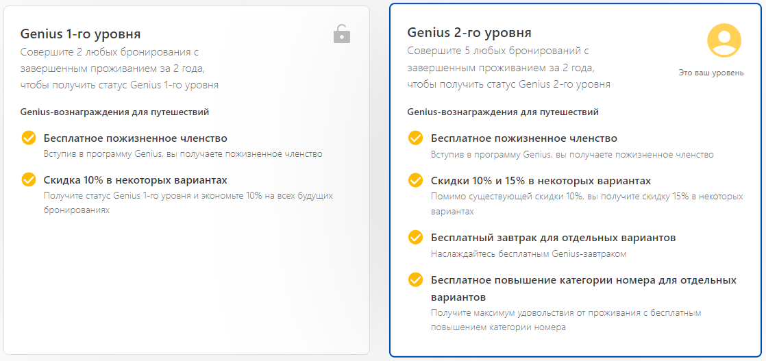 Статус «Genius 2-го уровня» означает, что вы можете получить бесплатный завтрак или повышение категории номера для некоторых вариантов, а также пожить в некоторых отелях со скидкой не 10%, а 15%.
