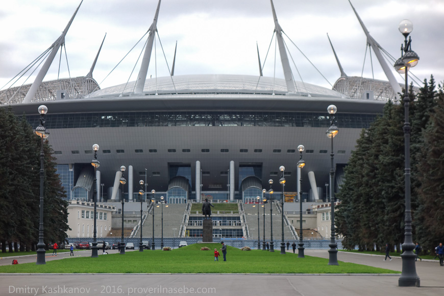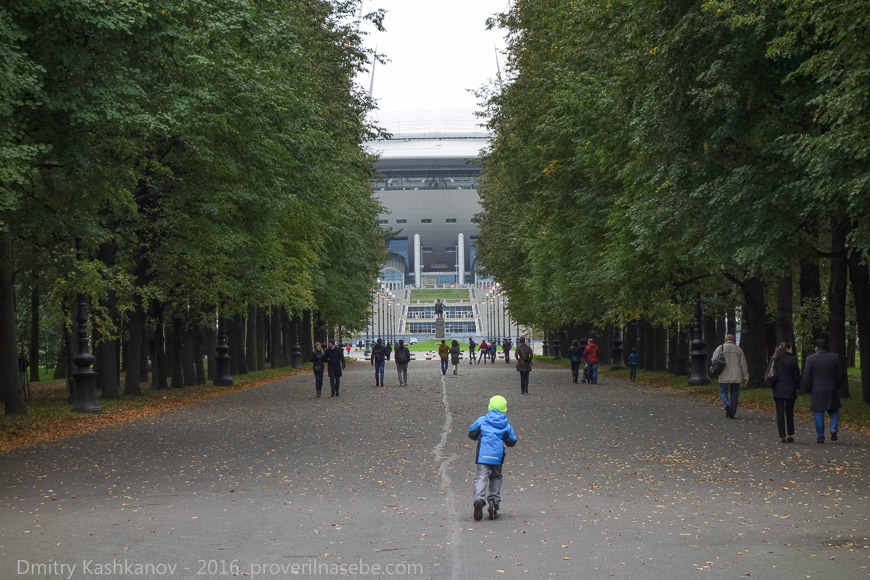 В середине главной аллеи есть целая площадь с фонтаном и лавочками. А в конце находится печально известный стадион, который строится к чемпионату мира по футболу 2018 года. Говорят, на его достройку были брошены средства, которые закладывались в городском бюджете на школы и детские сады. Правильно! Спорт – он важнее!