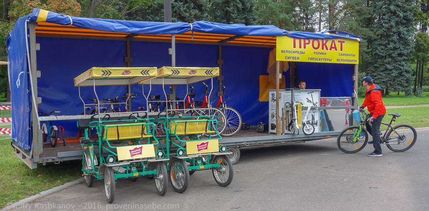Еще одна вещь, на которую можно потратить деньги в Парке Победы – это прокат транспортных средств. Здесь есть много чего. От простых детских самокатов до гироскутеров и сигвеев. Венцом инженерной велосипедной мысли, представленной в парке, являются многоместные веломобили. Их тоже можно взять в прокат и проехаться по аллеям парка с большой помпой, как настоящие короли в карете.