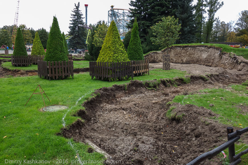 Любопытная деталь: во время нашего посещения проводился монтаж нового аттракциона. Была размечена территория, снят верхний слой почвы. Вначале я подумал, что это какой-то особый аттракцион. Например, скачки на диких буйволах. Лишь потом дошло: это просто разметка: