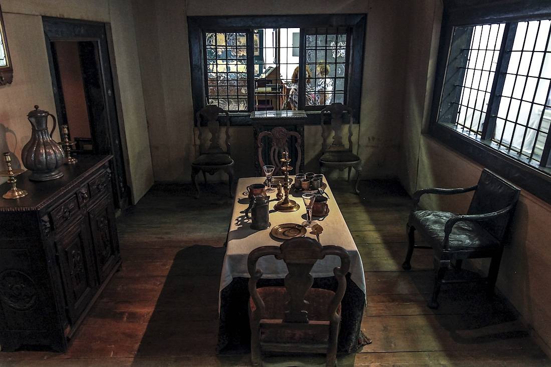 А так же современный и высоко технологичный, по тем временам, умывальник. Кровать, где спал Пётр не сохранилась и в комнате стоит ещё сундук, но не попал в кадр. Следующая комната это столовая. В столовой воссоздана обстановка XVIII века.