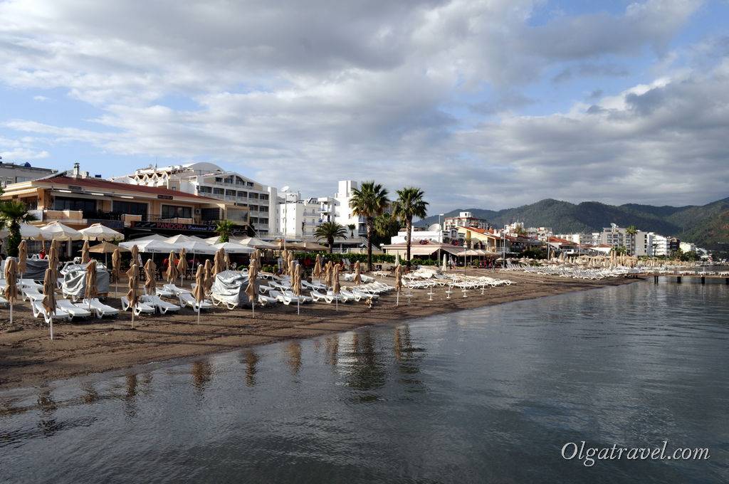 В центре Мармариса — неширокая береговая линия, заход в воду песчаный с мелкой галькой. Лежаки и зонты предлагают за 15 TRY (153 ₽). Еще можно купить напиток в баре и пользоваться инфраструктурой. На набережной — десятки баров, ресторанов и магазинов.