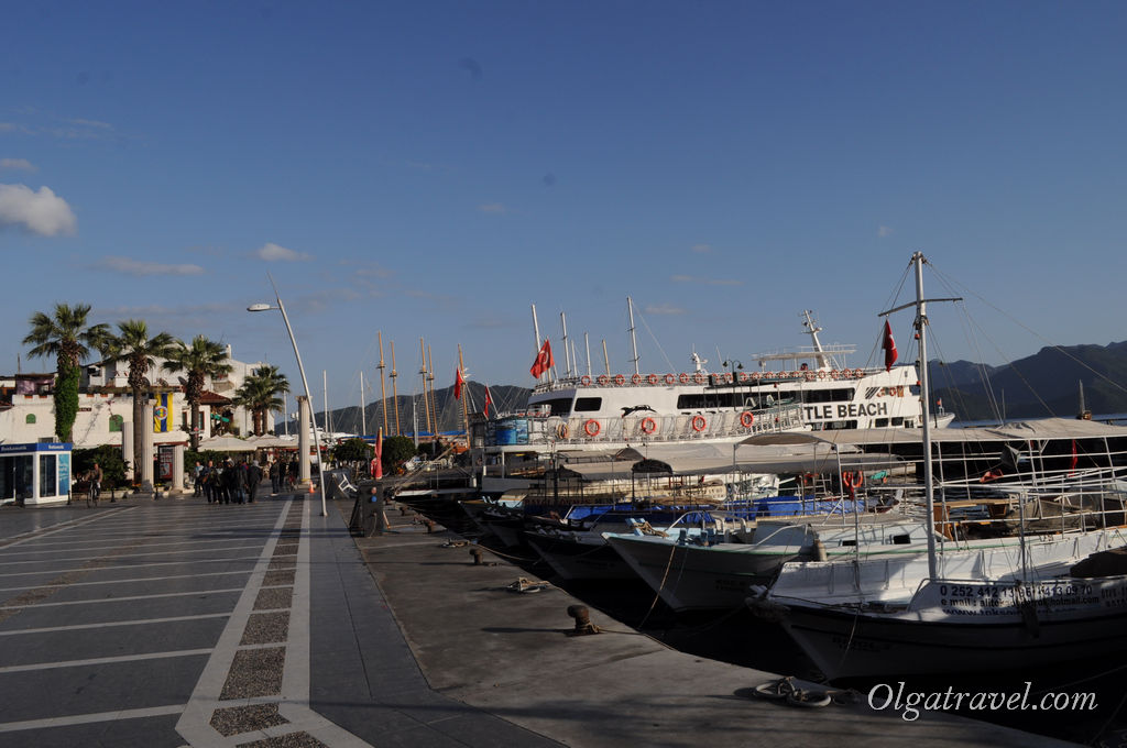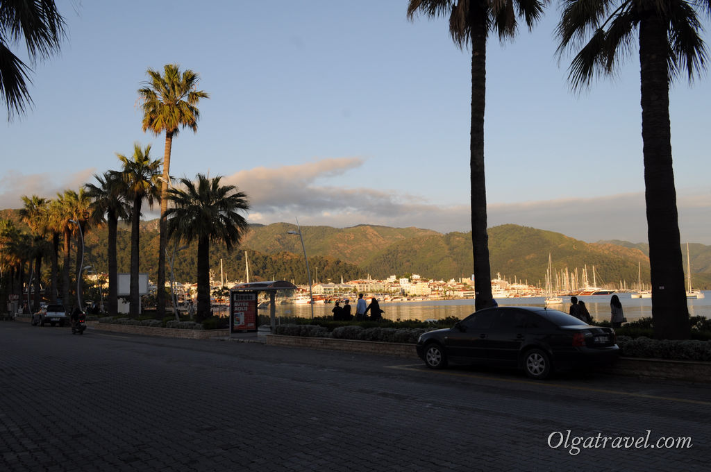 Вдоль берега Мармариса тянется красивая набережная с пальмами и лавочками. Так же вдоль берега пришвартовано много яхт и катеров, ведь Мармарис является портовым городом. Здесь вы так же можете найти ресторанчик и покушать, наслаждаясь видом на море.