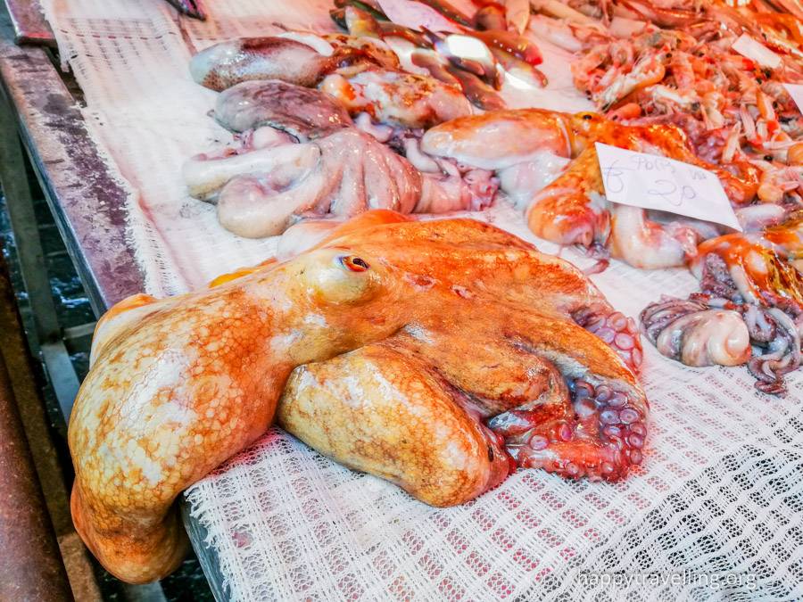 Гигантские головы рыбы-меч, какие-то совершенно плоские рыбы, огромные осьминоги, целые кальмары, лосось невероятных размеров… Все свежайшее, сочнейшее и по совершенно смешным ценам!