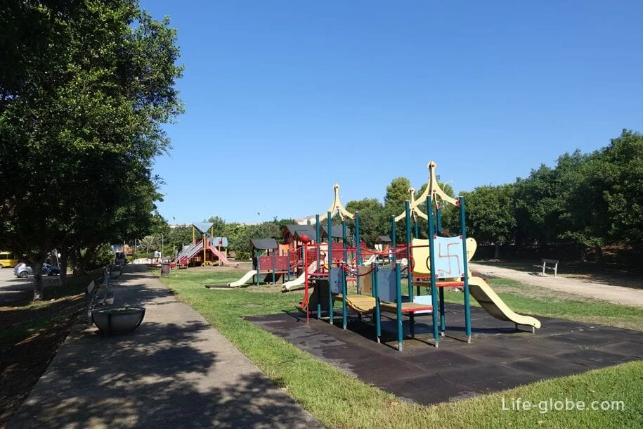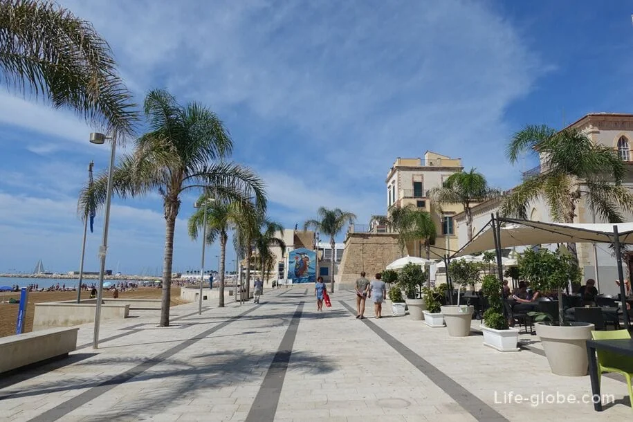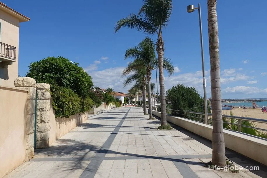 Выше линии пляжа пролегает отличная набережная – прогулочный променад. Набережная чистая и привлекательная, а также весьма протяженная, вечерами на набережной многолюдно, местные жители и гости города гуляют, сидят в кафе и ресторанах, расположенных вдоль набережной.