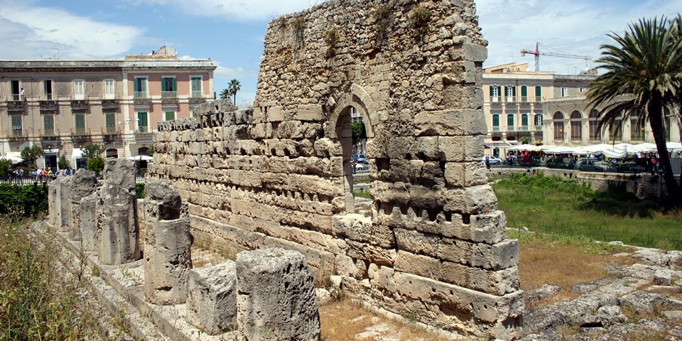 Именно с этого места начались Сиракузы. Это первая постройка в городе. Она была возведена в VI веке до н.э. Монолитные колонны, из которых был построен храм, были привезены по воде. Этот храм успел повидать всю историю Сиракуз. Он был и греческим храмом, и византийской церковью, и мечетью, и норманнским храмом и даже испанской казармой. Сейчас же от былого величия осталась лестница времен Византии и несколько стен.