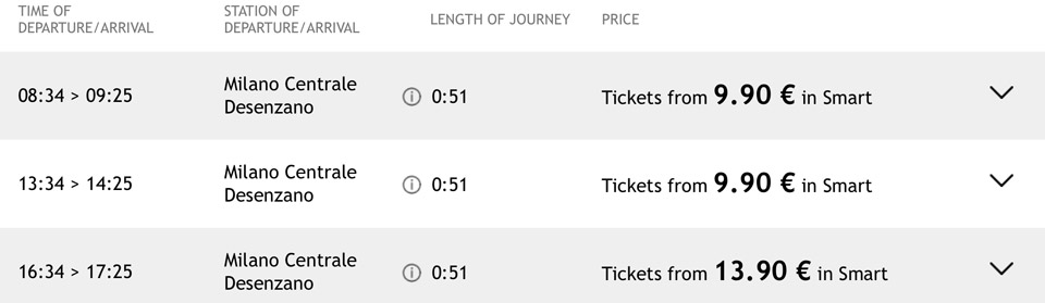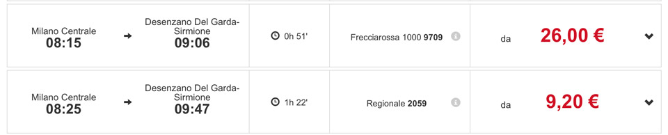 Несколько раз в час с центрального вокзала Милана (Milano Centrale) до станции Дезенцано отправляются региональные и скоростные поезда Трениталии. На скоростном поезде Frecciarossa добраться можно всего за 51 минуту, билет стоит 26 евро. Региональный поезд идет около полутора часов и обойдется вам в 9,20 евро.