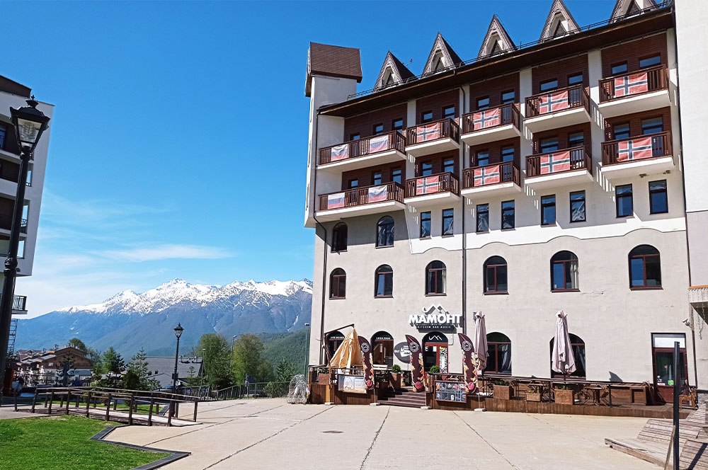 Нижний уровень — Роза Долина. Раскинулась на двух сторонах горной реки Мзымта, которая в Адлере впадает в Черное море. Отели здесь в основном 4-5*. Все предлагают ски-пасс на канатную дорогу Олимпия за символическую стоимость 100 ₽. Плюс скидка 30 % на подъем на вершину Роза Пик (2320 метров). Где селятся туристы в Роза Долине?