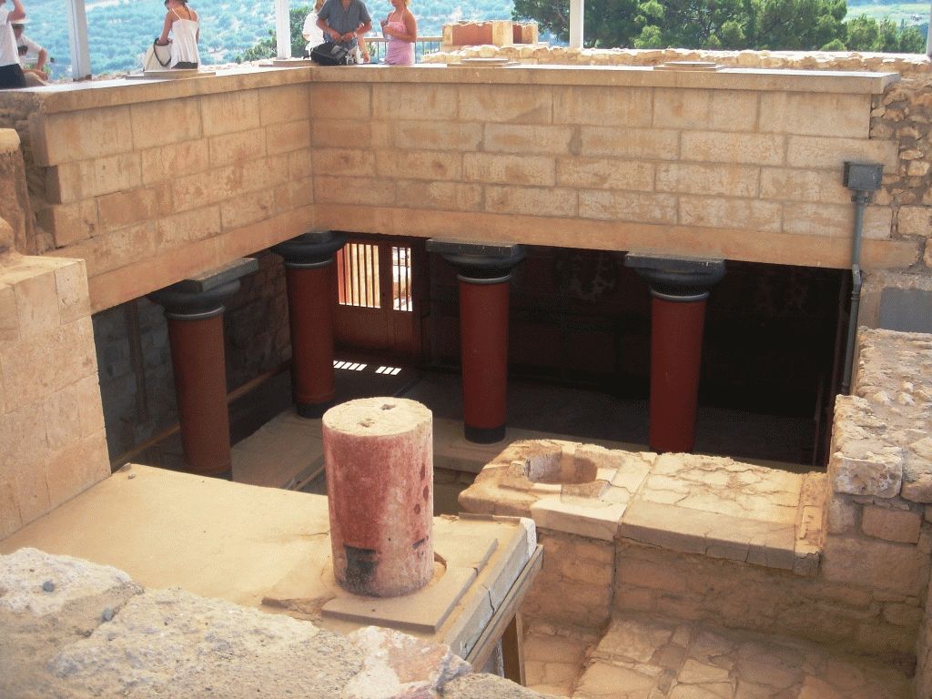 В результате раскопок также был обнаружен и тронный зал царя Миноса, который Эванс позже восстановил. Удобный для человека трон, возвышался на высеченных из камня стеблях. Спинка трона, украшенная волнами, была приделана к стене. На стене застыли изображения грифонов. Завораживающее зрелище по меркам древней цивилизации.