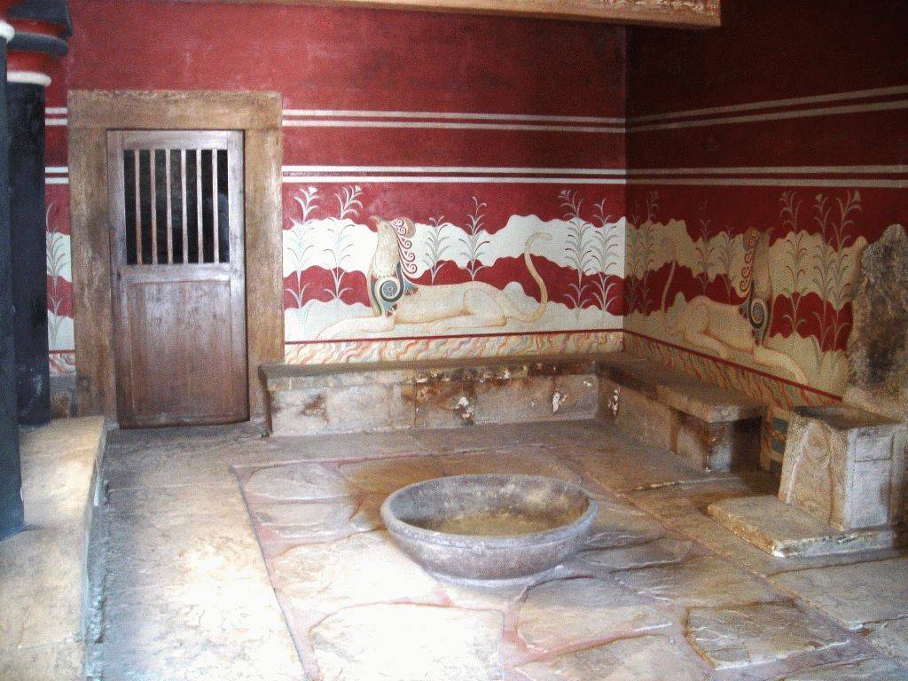 На стенах Тронного зала повсюду были изображены лежащие среди лилий грифоны. Сэр Эванс, который обнаружил Кносский дворец и руководил раскопками, в существовании царя Миноса не сомневался, а потому считал, что он был не только правителем, но и верховным жрецом. Поэтому мифические животные здесь находились не зря – голова орла символизировала Воздух, тело льва – силу Земли, хвост змеи – потусторонний мир.