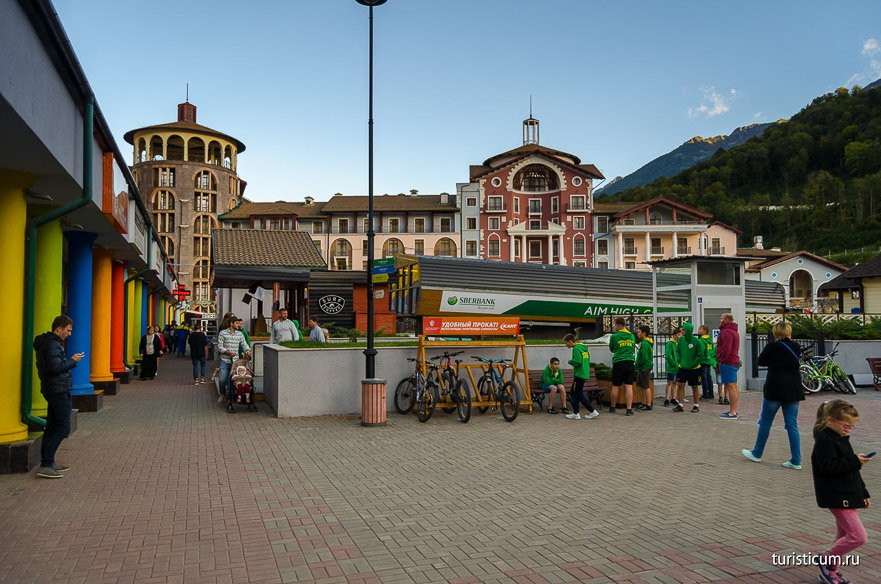 На небольшой территории сконцентрировались торговые галереи, магазины, развлекательный центр, спортивные комплексы, аквапарк с детскими площадками. Променады хорошо совершать по широкой набережной вдоль реки Мзымта. Здесь все продумано для удобства туристов: широкая пешеходная зона, пункты проката велосипедов и самокатов, уютные места для отдыха. Именно с Нижнего города на отметке +540 м начинается канатная дорога.
