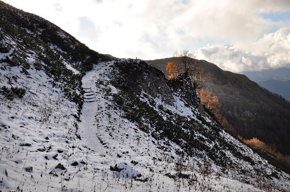 Я уже писал, что октябрь – переходный месяц в горах Красной поляны и пару раз в месяц обязательно случаются первые снегопады. Осенью 2016 года я прогулялся на хребет Аибга по новому для себя маршруту (отчет пока не готов), закончив этот поход эко-тропой «Альпийские луга». Проход по тропе, конечно, был ВОСПРЕЩЕН, но запретить идти никто не может. Правда на тропу я выходил со стороны гор и у канатки уже заканчивал поход. Возможно, если бы я начинал от канатки, меня бы и остановили…