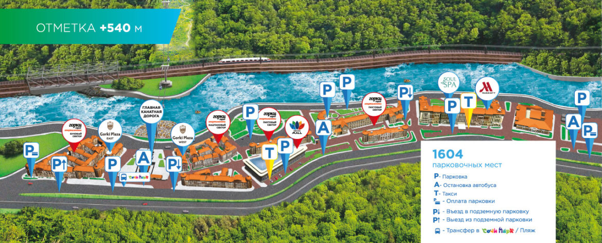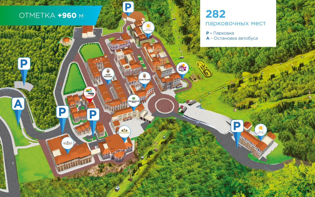 Курорт условно можно разделить на две части. Одна – «Горки Город» +540 – разместилась на высоте 540 метров над уровнем моря. Другая же его часть – «Горки Город» +960 – соответственно, на высоте 960 метров. Соединяются они между собой канатной и автомобильной дорогами.