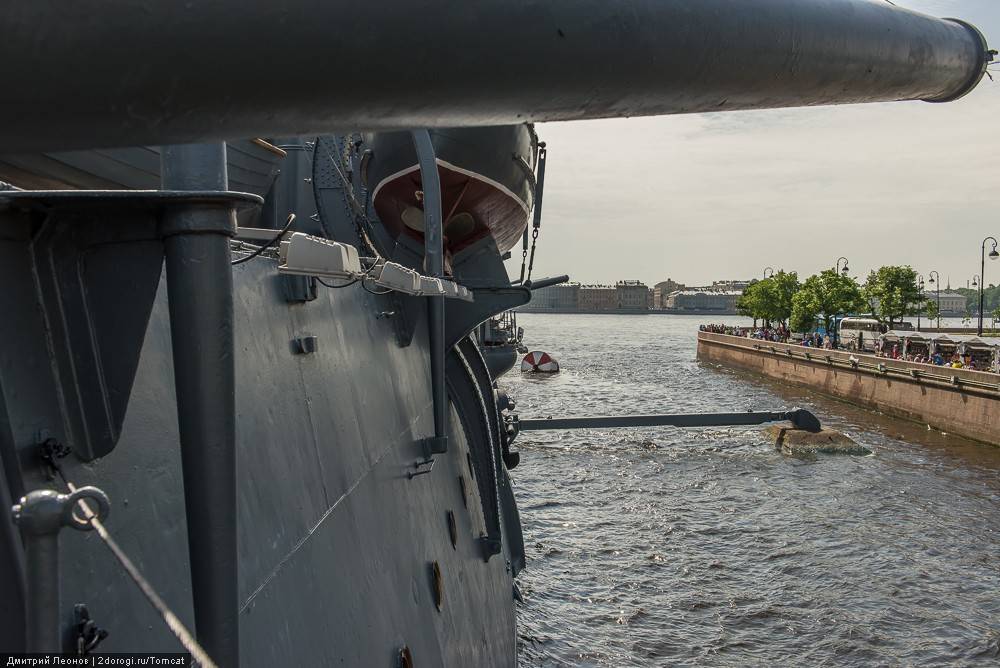 С поверхности воды крейсер выглядит гораздо более величественным, чем с набережной, через паутину проводов и сувенирных палаток.