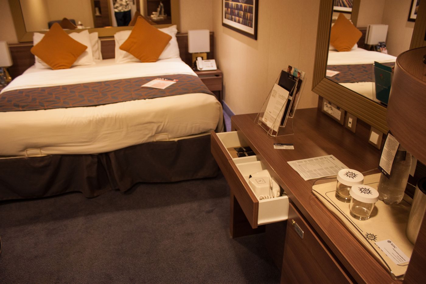 - Средний класс – каюты с окнами, выходящими во внутренний атриум или расположенные ниже отметки главной палубы и имеющие круглые смотровые окна-иллюминаторы. Площадь их не более 20-25 м2, к основной кровати может быть добавлен небольшой диван для чтения и отдыха.