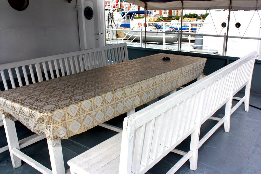 На верхней палубе теплохода расположена кают-компания, камбуз, ходовая рубка, 2 душа, 2 гальюна, вход в каюты, сауна. Кают кампания разделена с камбузом стенкой. С передней части корабля, трап ведет в носовую каюту.