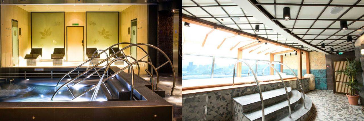 На всех лайнерах есть SPA-центр. Термальная зона небольшая. Есть бассейн с гидромассажем и несколько саун: сухая, ароматизированная и хамам. Рядом находится комната отдыха, где можно выпить чашечку чая. Есть каменные лежаки с подогревом. Недельный абонемент обойдется в 149$, на один день посещение не продают. На старых кораблях посещение саун бесплатно, а на новых – платно. В SPA-центре представлен широкий спектр процедур для лица и тела: различные виды массажа стоимостью от 165$ за 75 минут, обертывания, иглоукалывание, косметические процедуры. В салоне красоты можно сделать маникюр за 45$, педикюр за 65$, укладку волос стоимостью от 55$ или отбеливание зубов за 149$.