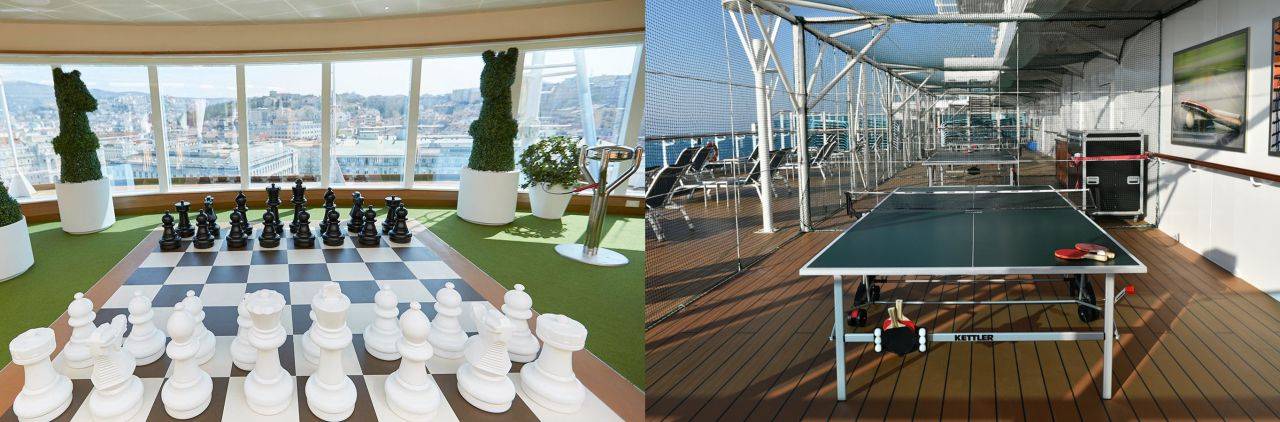 На лайнерах есть беговая дорожка и спортивная площадка оборудованная для игры в баскетбол, волейбол и мини-футбол. Есть зона игр на свежем воздухе: шахматы, шаффлборд, настольный теннис, мини-гольф.