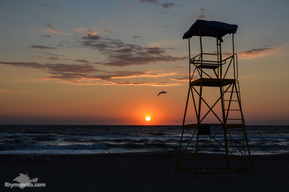 Забавная конструкция для фотосессий — для других целей на желтую вышку никто так и не залез. Можно смотреть на ныряющее в море солнце выше остальных. И немного дольше.