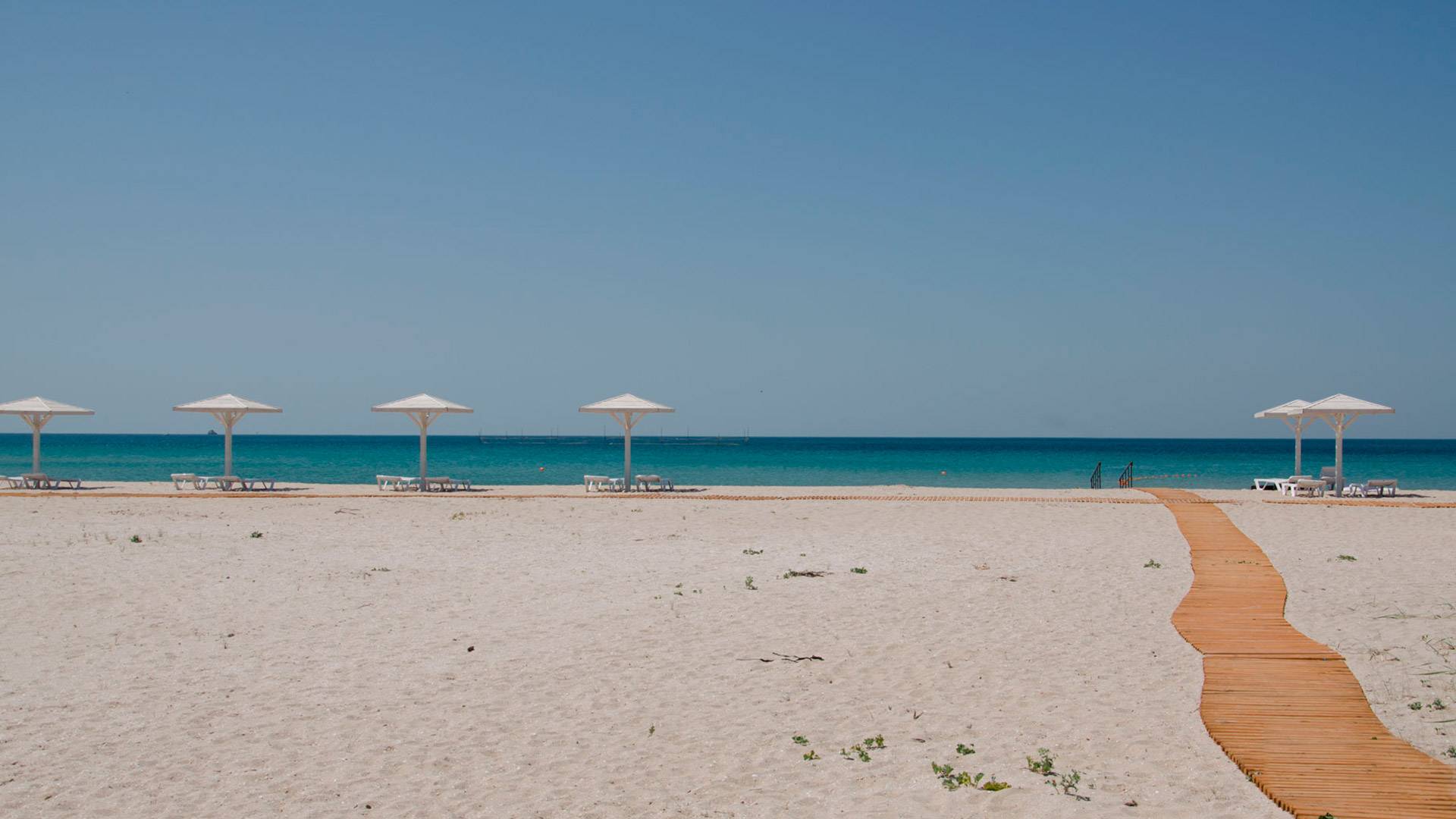 Это почти тропический рай с широкой косой белого песка, растнувшейся на 2 км. Здесь нет гальки или ракушек, а цвет воды радужно-лазурный. Вода чистая даже во время штормов, так как нет глины. Перепадов глубины нет, что очень привлекательно для детей — даже, отойдя на несколько десятков метров от берега, вы будете твердо стоять на ногах.