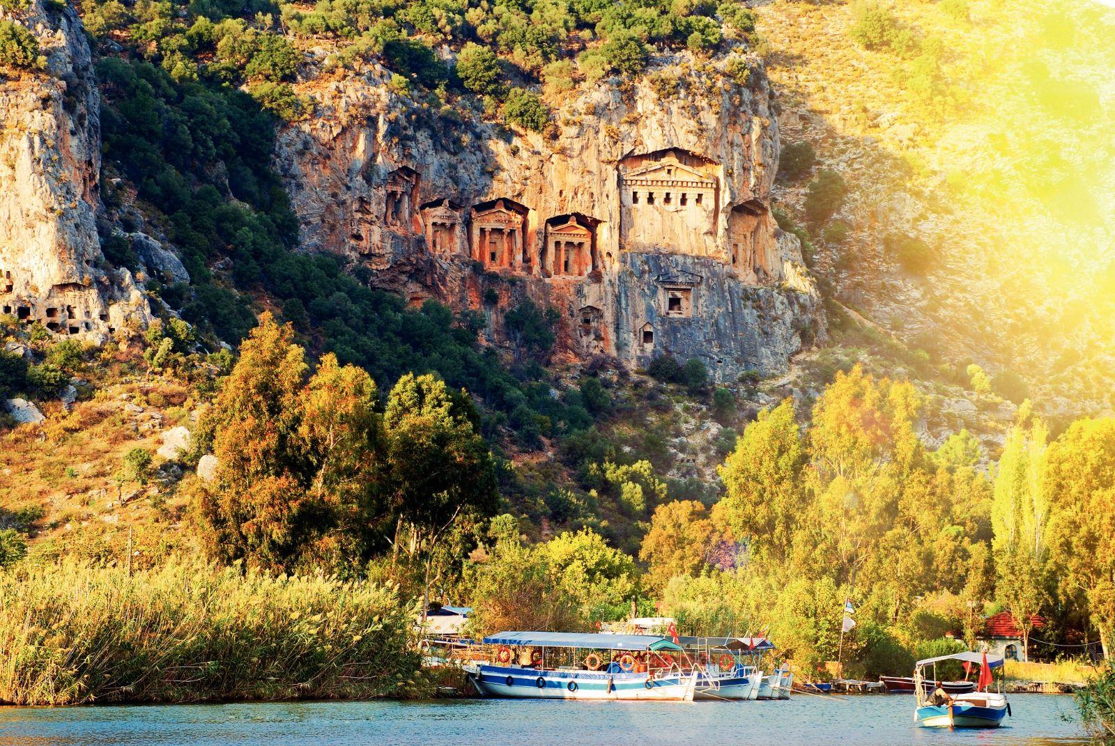Ликийские гробницы. В этом загадочном месте захоронены древние ликийские короли. Гробницы, выточенные прямо из скалы тысячелетия назад, нависают над красивейшей рекой. Ликийцы хоронили всех своих умерших как можно выше, веря, что так их души будут ближе к богу. Также они клали в гробницы вещи, которые, по их мнению, могли пригодиться в загробной жизни. Поэтому после исчезновения народа гробницы разграбили в поисках сокровищ.
