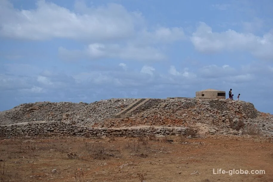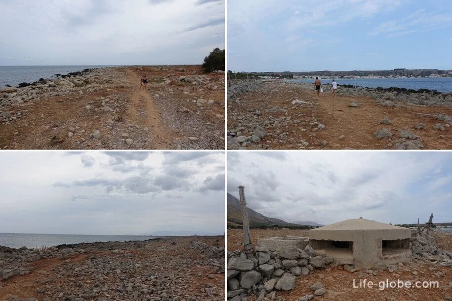 Если двигать на север, в сторону горы Монте Монако, здесь, у подножия горы, в основном каменистое побережье, на тропе камни и грубая почва, есть несколько исторических памятников, а также мусор и какашки)). Соберетесь в данном направлении, советуем надеть обувь, так как легко получить колючку в ногу.