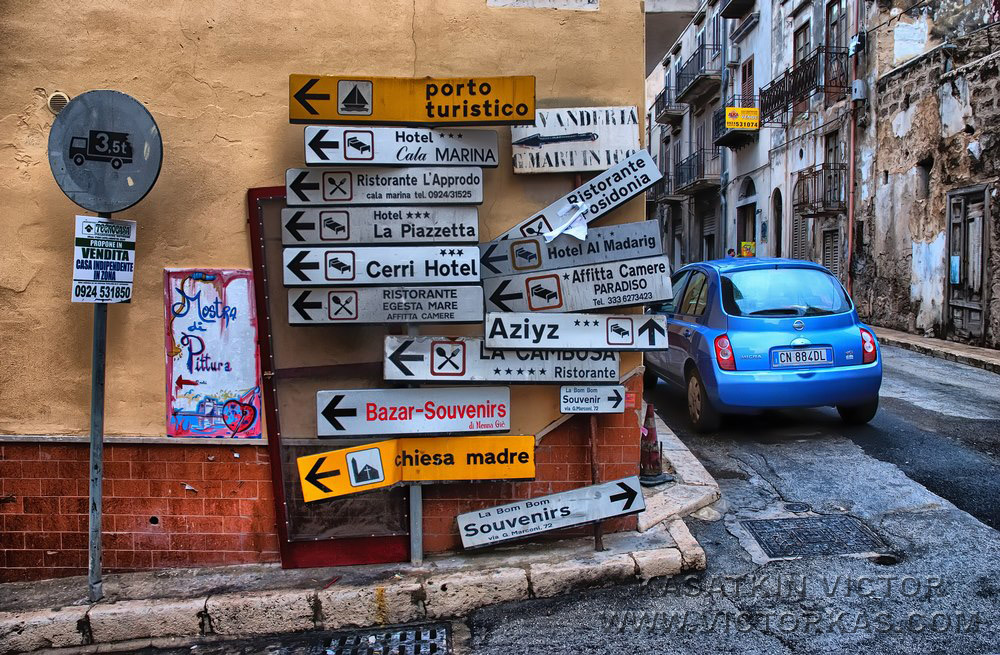 Лукавый лик города объединил в себе все: корабли в порту, ажурную вязь готического декора Кафедрального Собора, площадь Вильена («четырех углов»), улицу Виарома, полную нескончаемых сюрпризов, и Фонтан Претория (1573 г.). Он изображает полуобнаженных мифических обитателей моря, шокирующих даже самих сицилийцев. Это один из многих парадоксов острова.