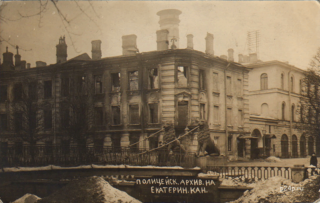 Фото 1917 года. Сожгли полицейский архив, находящийся рядом с Львиным мостом. Фото prlib.ru/item/680138