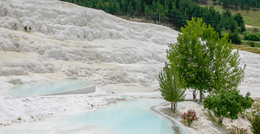 При фотосъемке белых травертин Памуккале стоит учитывать, что на солнце они действительно выглядят как снежно белые и сильно контрастируют с остальными объектами, которые могут попасть в кадр. Если Вы захотите сфотографироваться на фоне травертин, лучше включить вспышку. Она подсветит лицо и оно не будет таким темным, как при обычной съемке. Кроме того, будет совсем не лишней последующая обработка фотографий в Adobe Lightroom: