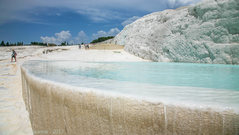 Вообще, это удивительное место. Если бы не поджимало время, можно было бы убрать фотоаппарат в рюкзак и забраться вот в эту ванну. Вода там чистая, теплая. На дне – мелкий белый ил. В ванне можно лежать бесконечно. По нашему скромному мнению, это даже интереснее, чем отдых на берегу моря. Неудивительно, что некоторые туристы едут не на побережье, а прямиком сюда. Снимают тут номер на неделю-две и наслаждаются жизнью. Ближе к вечеру или с утра людей здесь почти нет. Туристические автобусы приходят часам к одиннадцати. Так что будет время и поплескаться и пофотографировать.