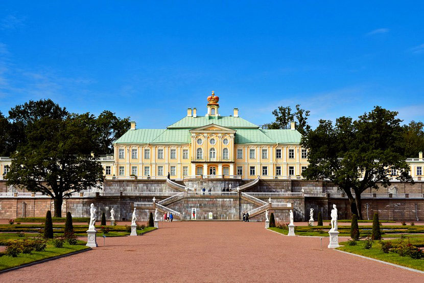 Дуга Большого Меншиковского дворца длиной 210 м буквально парит над берегом залива и связана с ним морским каналом. Центр постройки занимает двухэтажный корпус, украшенный княжеской короной. К нему примыкают одноэтажные галереи с павильонами. Грандиозный размах прекрасная отделка и роскошь интерьеров вызывают восхищение всех туристов.