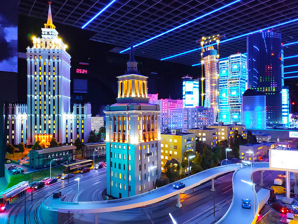 Отдельно стоит сказать, что потрясающее зрелище на макете в момент смены времени суток, когда подсвечивается буквально всё: дороги, здания, мосты, машины и поезда едут с включенными фарами. Это так же красиво, как смотреть на ночной город с какой-нибудь высокой точки, но здесь чуть другое ощущение, потому что видишь эту жизнь так, будто она находится в эту минуту на твоей собственной ладони!