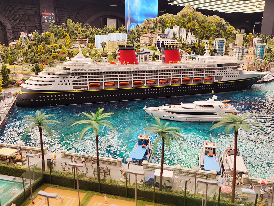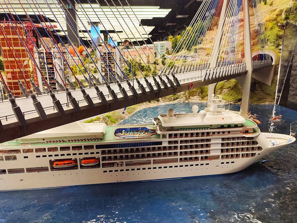 На уникальном музейном макете изображено много красивых мостов, рек, а также будет интересно взглянуть на красивые большие круизные лайнеры и теплоходы. Когда соотносишь их размер и размер, например, человечка, стоящего где-то рядом, представляешь какое огромное это судно в реальной жизни. Не каждому повезет побывать на его борту и посмотреть лично, а здесь – пожалуйста, смотри, сколько хочешь!