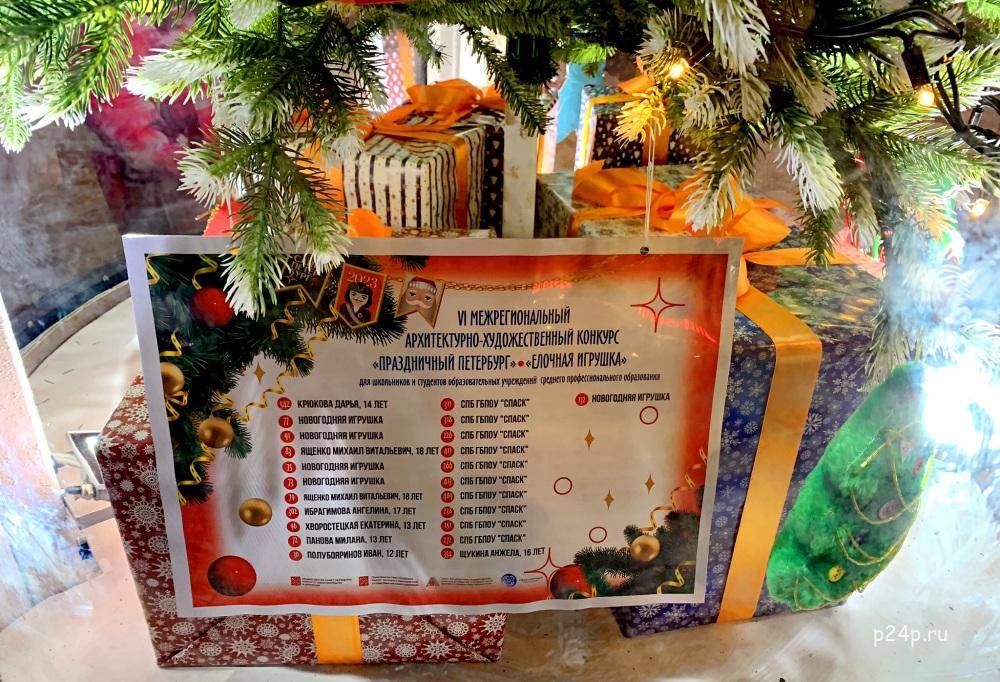 А вдоль Невского — традиционные стеклянные «колбы». В 2022-2023 году в прозрачных витринах установили вот такие ёлочки с игрушками, которые сделали дети. Каждая игрушка пронумерована, а внизу табличка с авторами.