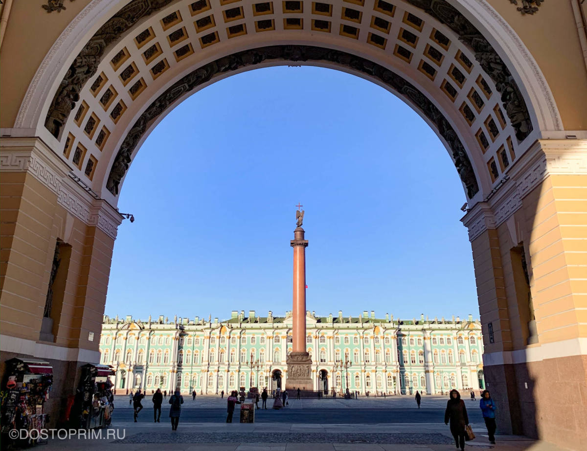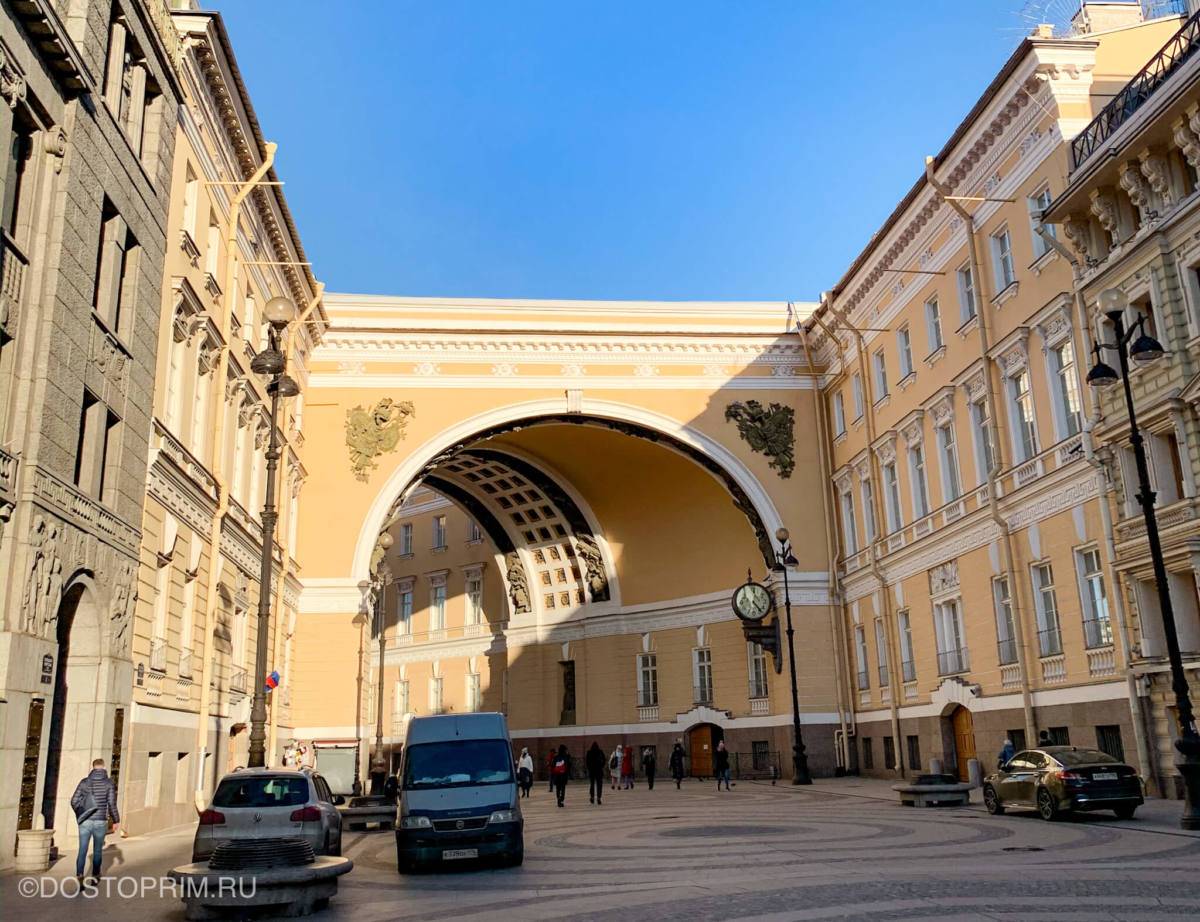 В арке Главного штаба обратите внимание на первые электрические часы в Санкт-Петербурге. На двухметровом круглом циферблате написано «Главная палата мер и весов»