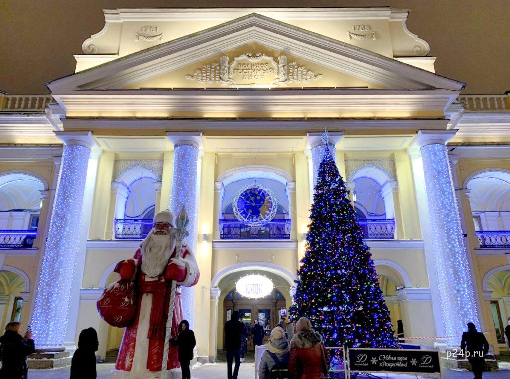Красивая новогодняя локация на Невском проспекте у входа в Гостиный двор. Здесь установлен большой Дед мороз и ёлка.