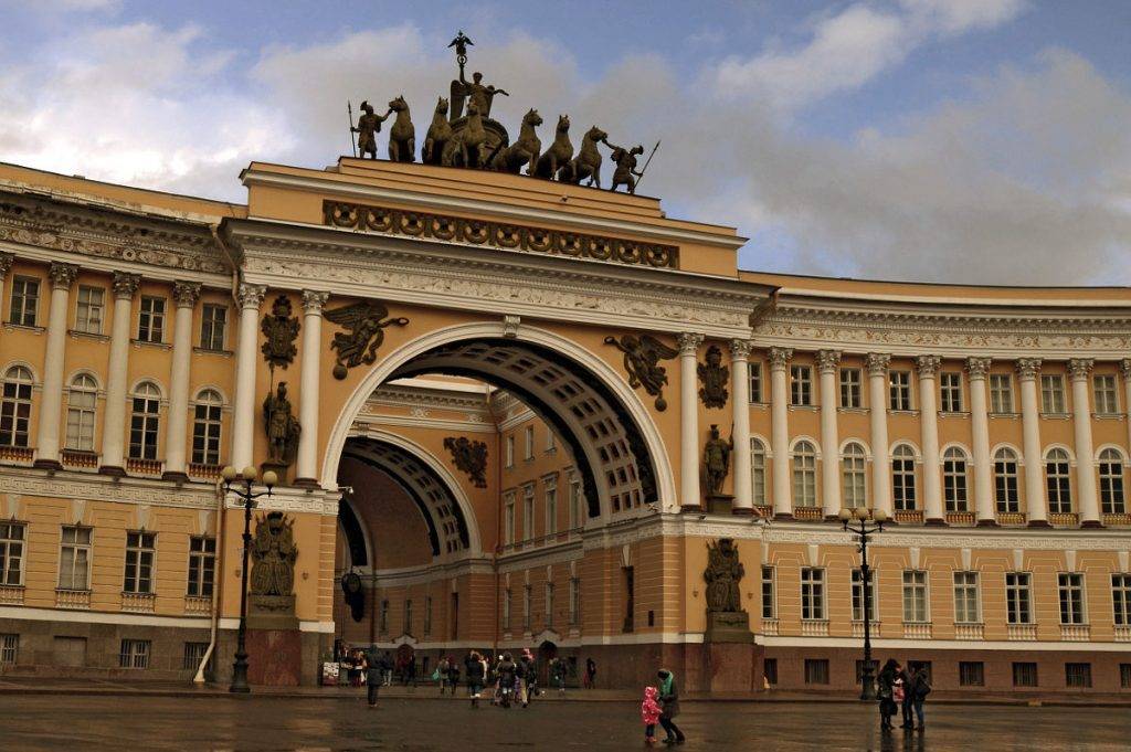 На Дворцовой площади напротив Зимнего дворца дугой протянулось здание Главного штаба из двух корпусов, соединенных триумфальной аркой в центре. Это еще один памятник в честь победы над войском Наполеона в 1812 году.
