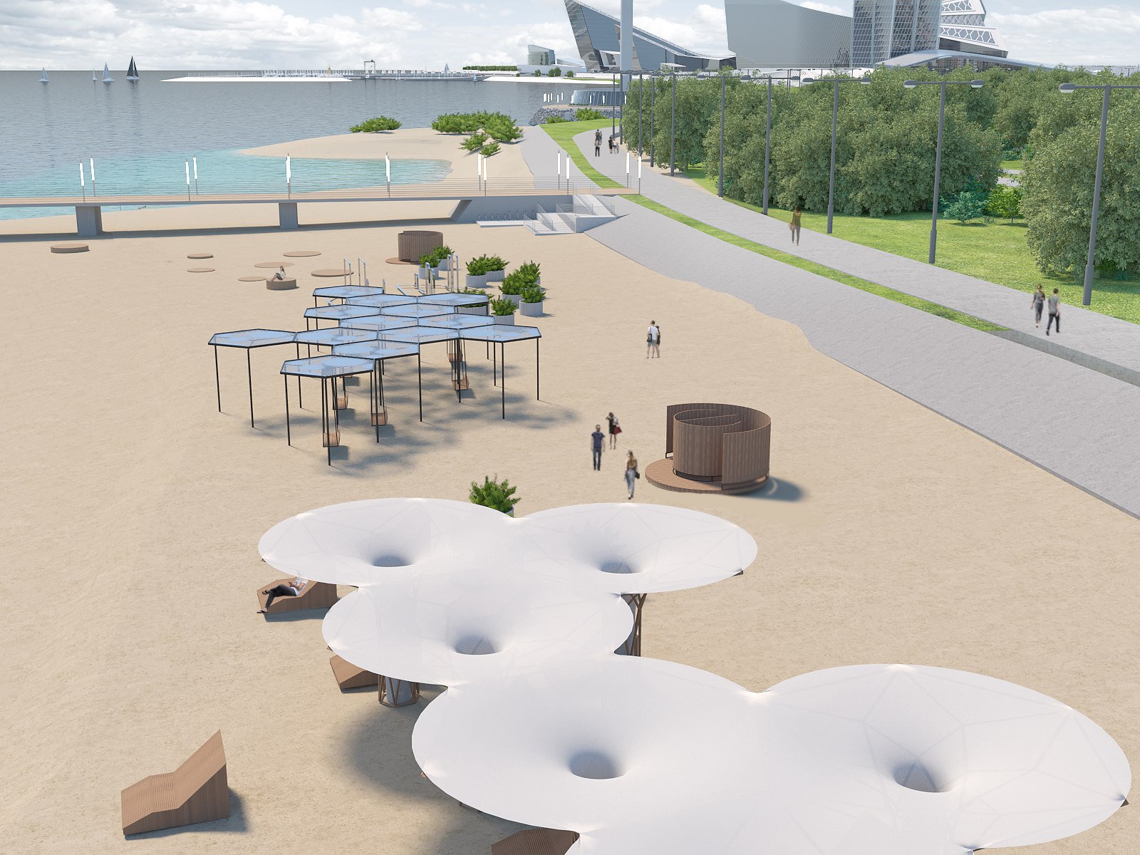 Во-вторых, на пляже появятся дорожка для променада, кабинки для переодевания, качели, теневые навесы, оборудованные места отдыха, велопарковки. От парка к береговой линии сделают удобные спуски для маломобильных граждан и родителей с колясками.