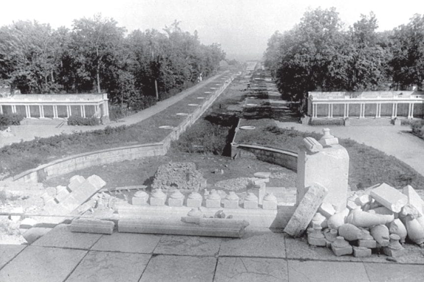 Фашисты вырубили много парковых деревьев. Тут и там виднелись противотанковые завалы, которые немцы устроили из старых спиленных стволов. Подземные водопроводы были сломаны, а ценные монументальные скульптуры и барельефы – пропали.