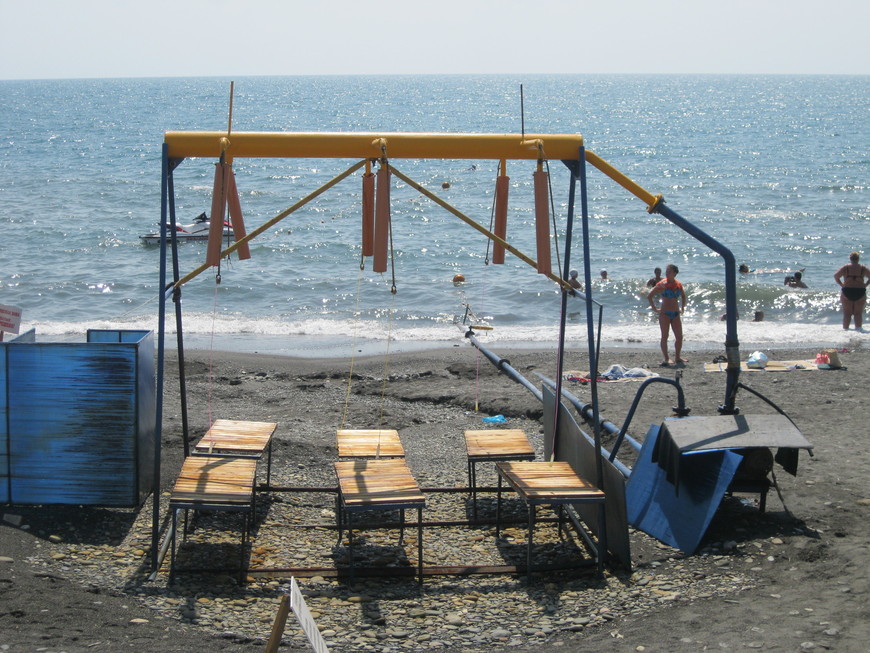 На детском пляже Чайка очень мелкая галька. А еще тут уменьшено расстояние разрешенной для купания акватории, что видно по буйкам на фото. Инфраструктура пляжа в общем — стандартная, за исключением акцента на детей: есть надувные аква-горки, анимация и вход на пляж оборудован ровным пандусом. На коляске заехать не составляет труда.