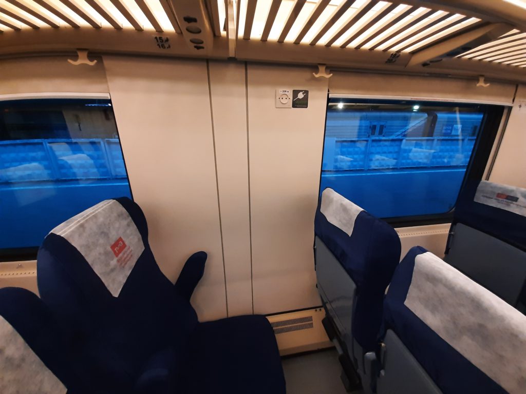 Здесь нет ни откидных спинок кресел, ни выдвигающихся вперед сидений (как в «Сапсанах»), ни розеток (две на вагон – возле мест 15, 16 и 51, 52 – видимо, как компенсация за отсутствующее окно).