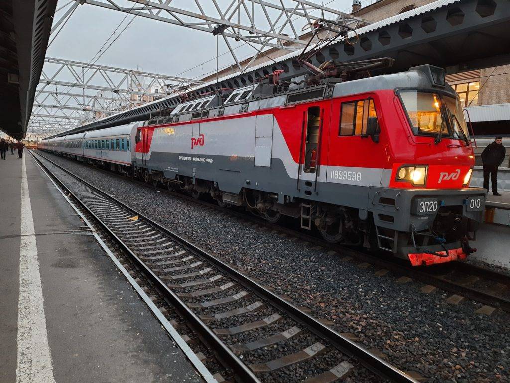 Зато удалось посмотреть на поезд с другой платформы. В первый рейс мы поедем с электровозом ЭП20.